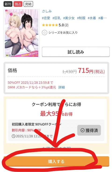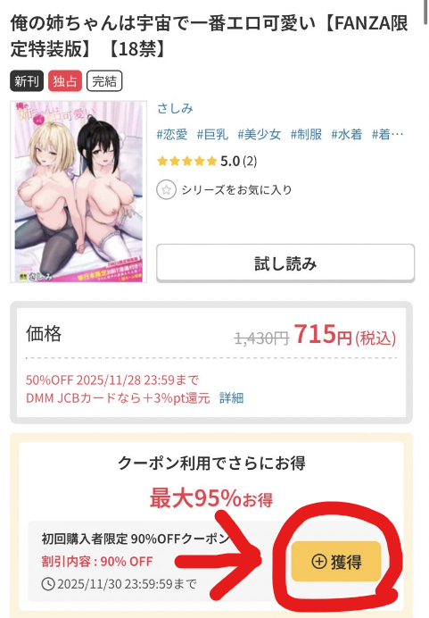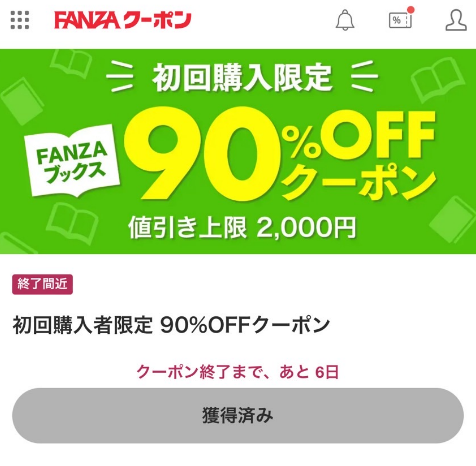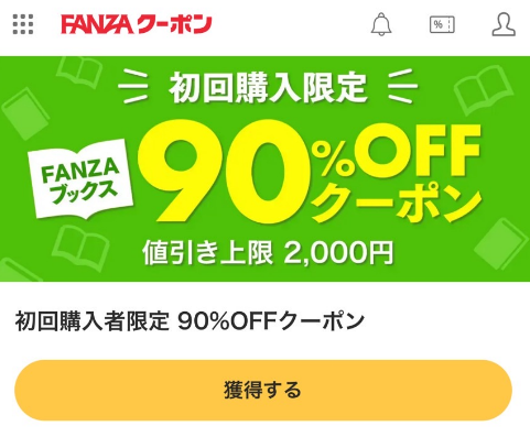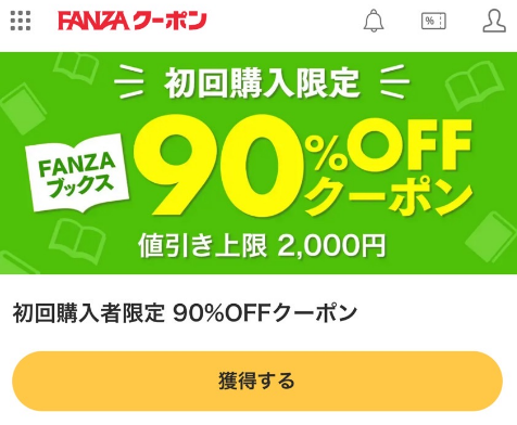 ③ページ中ほどの90%オフクーポンの「獲得」をタップする。