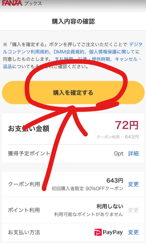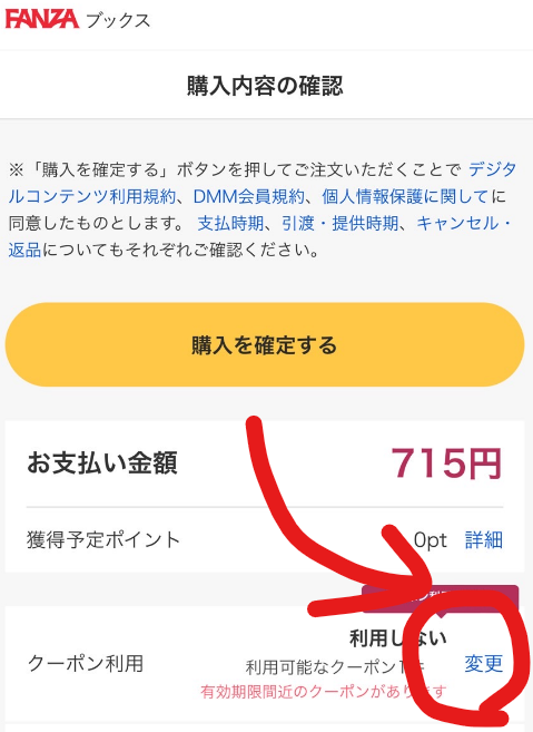 【重要】購入内容確認画面でクーポン利用の「変更」をタップする。