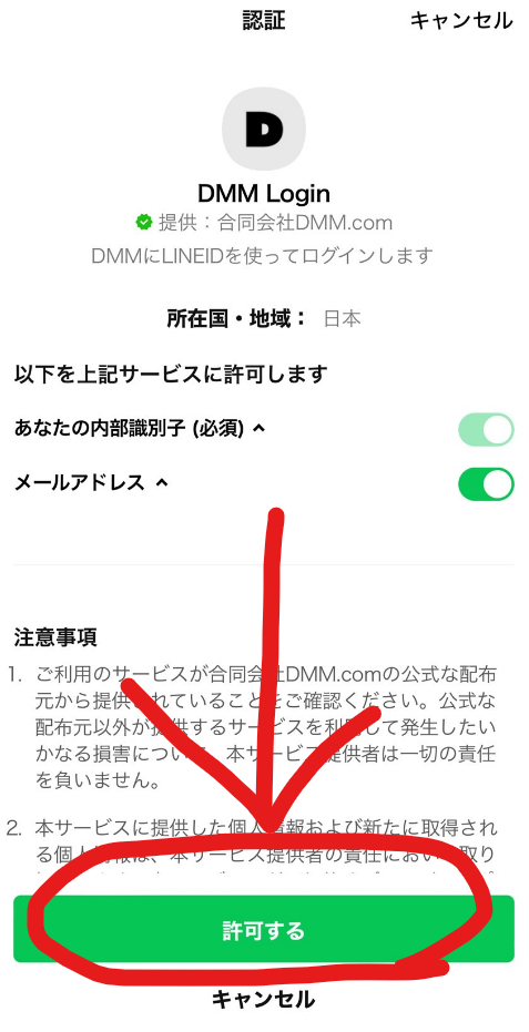 ⑥Lineアプリが開かれるので、Lineの認証画面で「許可する」をタップ。